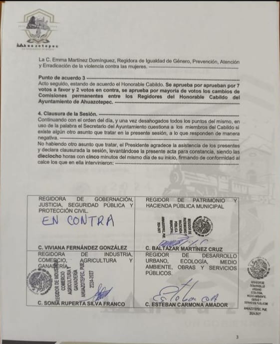 Asimismo, denunció que los regidores de oposición no fueron tomados en cuenta en las decisiones, lo que refuerza la percepción de una sesión cargada de acuerdos previos entre los partidos mayoritarios (PRI, PAN, PRD y PSI).