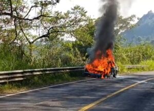 Huauchinango, PUE – La tarde de este martes, unidades de emergencia acudieron a la zona de Patoltecoya, para sofocar el incendio de un vehículo tipo Tzuru sobre la carretera federal México-Tuxpan.