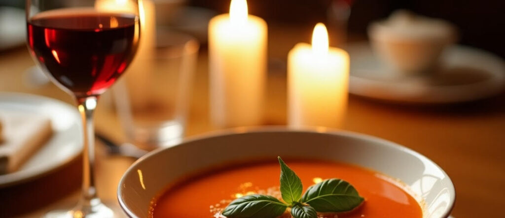Para esta velada, un vino tinto joven y afrutado, como un Tempranillo o un Merlot, resalta la intensidad del tomate, armonizando con la calidez de la crema sin opacar sus matices. Si prefieres un giro más fresco, un vino blanco Chardonnay aportará una nota ligera y untuosa, envolviendo cada cucharada con delicadeza.