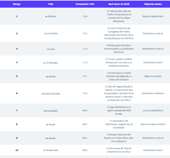 Desde el corazón de los Alpes albaneses hasta la costa pacífica de El Salvador, nuestra clasificación de los mejores países para visitar en 2025 destaca destinos preservados del turismo masivo, auténticos y asequibles. En nuestro top 10, Albania seduce con sus montañas salvajes, mientras que Colombia encanta con los colores de la ciudad fortificada de Cartagena. Laos, con sus orillas del Mekong y sus templos dorados, invita a la contemplación. Los surfistas y viajeros bohemios encontrarán su paraíso en El Salvador, mientras que Serbia brilla por su vida nocturna a lo largo del Danubio. Arabia Saudita revela sus tesoros arqueológicos en el desierto, Kazajistán ofrece caminatas únicas en el Altái, y Bután fascina con sus festivales tradicionales. Baréin sorprende por sus contrastes entre historia milenaria y modernidad futurista, y Guatemala transporta al corazón del universo místico de las ciudades mayas.