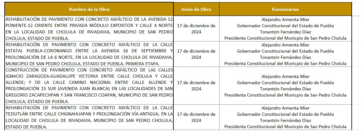 A mediados de diciembre del año pasado, la presidenta municipal de San Pedro Cholula, Tonantzin Fernández y el gobernador Alejandro Armenta Mier, iniciaron cuatro obras conjuntas muy importantes de construcción y rehabilitación de pavimento en las avenidas 12 poniente y oriente, 16 de Septiembre y prolongación 6 norte, entre otras.