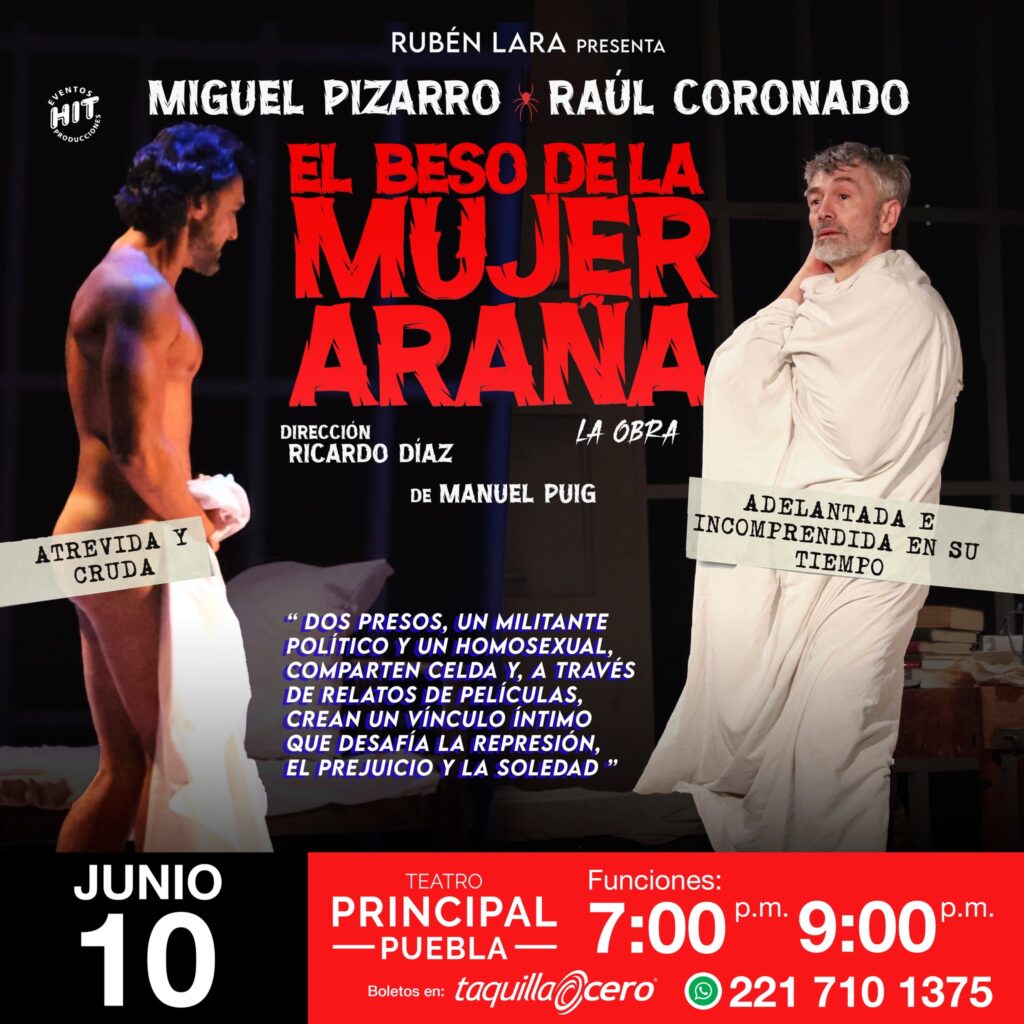 El martes 10 de junio en funciones de 19:00 y 21:00 horas se presenta en el Teatro Principal en la ciudad de Puebla la exitosísima obra teatral “El beso de la mujer araña”, protagonizada por el primer actor Miguel Pizarro y por el talentoso histrión Raúl Coronado.
