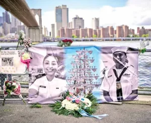 En Nueva York, se observaron las fotografías de la cadete América Yamilet Sánchez y el marinero Adal Jair Marcos, quienes murieron tras chocar con una sección baja del histórico puente, mientras realizaban una maniobra de zarpe.