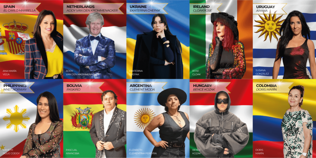 Este año, España estará representada por la talentosa diseñadora Ana María Vega, de la marca El Carlo Marbella. Ekaterina Chepak será la representante de Ucrania, destacándose como una de las diseñadoras más influyentes de su país y utilizando su arte como herramienta para luchar por la paz. Addy Van den Krommenacker representará a los Países Bajos, Bence Kozak lo hará por Hungría y Rose Cloak por Irlanda. Argentina estará representada por la diseñadora Elizabeth Pereyra, de la marca Clement, mientras que Bolivia será representada por Pascual Arancibia. Aiyana llevará la representación de Uruguay, Doris Marín presentará a Colombia, y Mayeth Sigue Codoy, diseñadora de la marca Maet, representará a Filipinas.