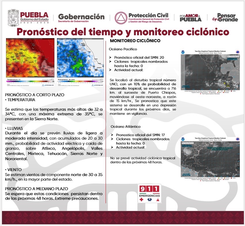 Además, probable actividad eléctrica y granizo sobre Atlixco, Angelópolis, Valles Centrales, Mixteca, Tehuacán, Sierras Norte y Nororiental.