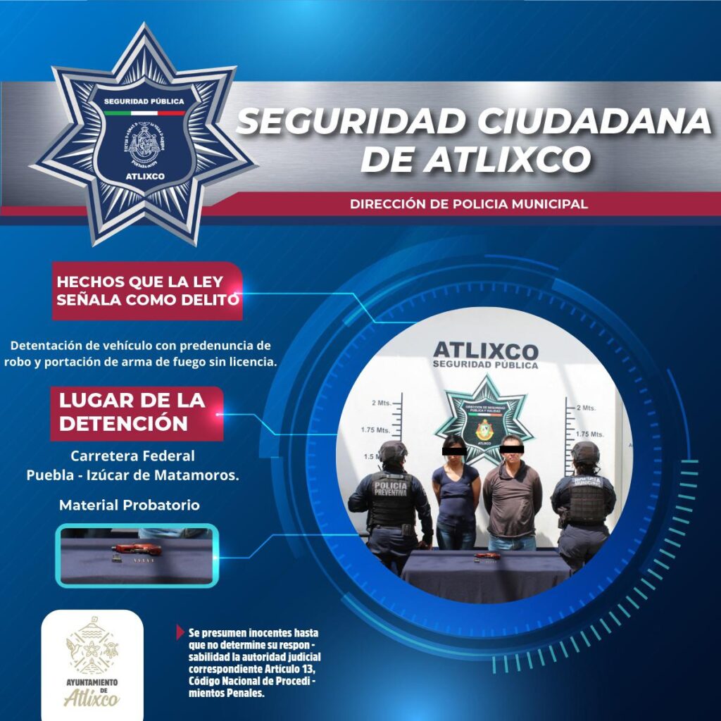 Como resultado de las acciones de vigilancia y patrullaje preventivo, elementos de la Secretaría de Seguridad Ciudadana (SSC) de Atlixco detuvieron a un hombre y una mujer que viajaban en un vehículo con pre denuncia de robo, en cuyo interior también fue localizada un arma de fuego sin licencia.