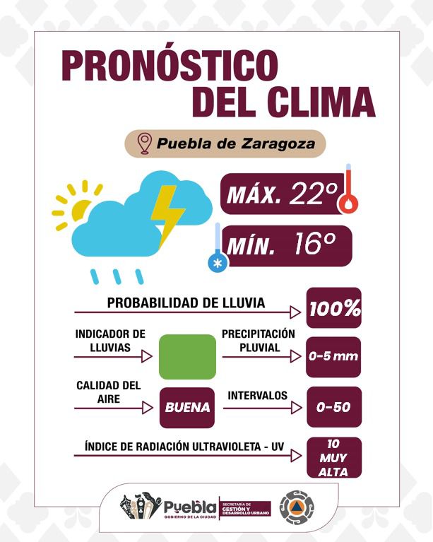 Puebla, Pue., 28 de mayo de 2025.– El Gobierno de la Ciudad informa que, de acuerdo con el pronóstico de la CONAGUA y el SMN, se espera un aumento significativo en las precipitaciones y condiciones climáticas en el municipio.