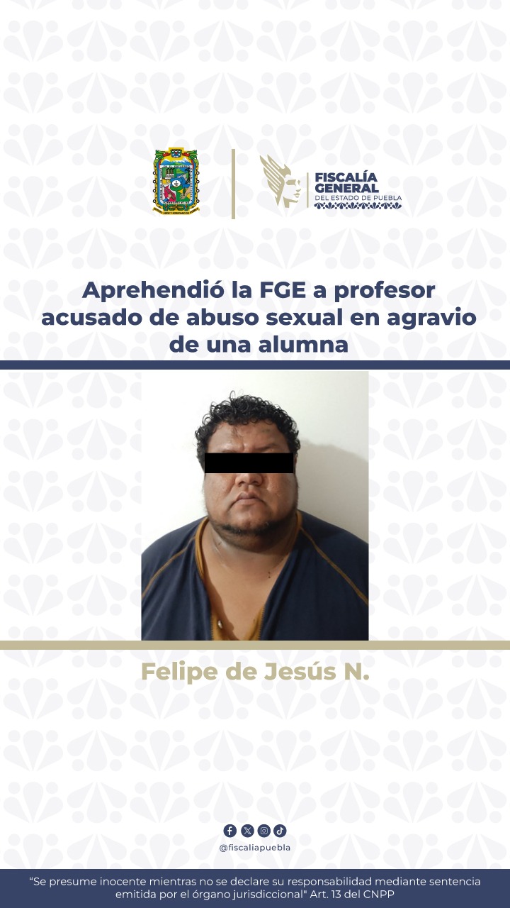 La Fiscalía General del Estado de Puebla dio cumplimiento a la orden de aprehensión en contra de Felipe de Jesús N., profesor de un plantel educativo ubicado en el municipio de Tepeaca, quien el pasado 27 de febrero presuntamente agredió sexualmente a una alumna y la amenazó para que no comentara lo sucedido.