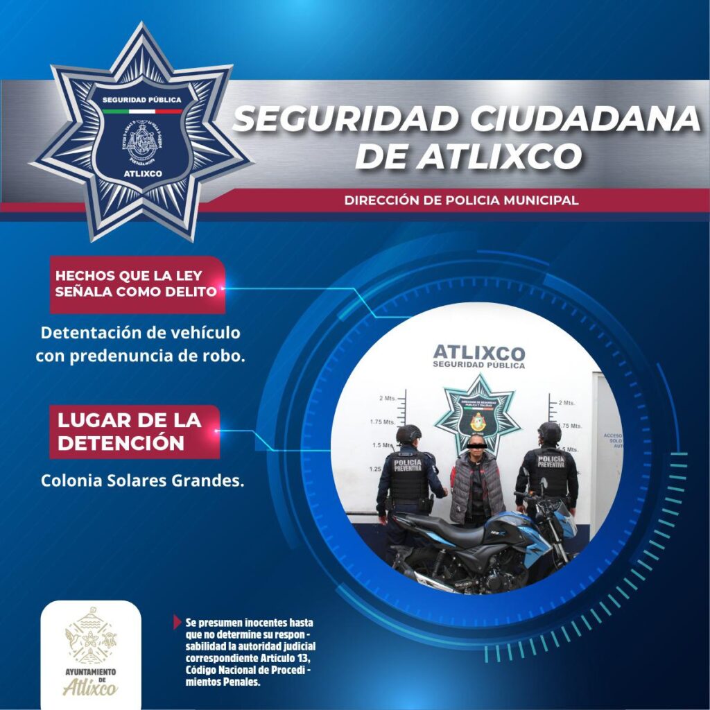 Gracias a una rápida y oportuna intervención, elementos de la Secretaría de Seguridad Ciudadana (SSC) de Atlixco recuperaron una motocicleta con pre denuncia de robo y detuvieron al conductor presuntamente implicado.