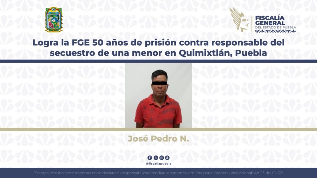 La Fiscalía General del Estado logró una sentencia de 50 años de prisión contra José Pedro N., declarado penalmente responsable del delito de secuestro agravado contra una menor de 14 años de edad en el municipio de Quimixtlán, Puebla.