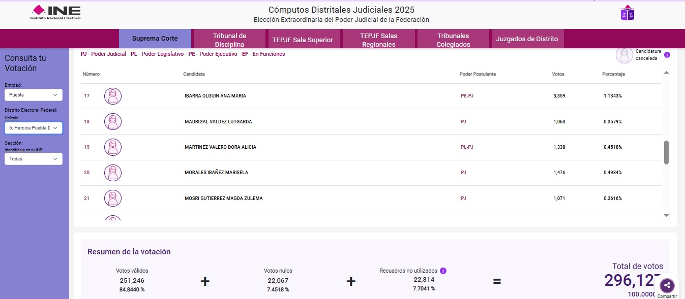 Un contexto similar rondó en la zona de San Pedro y San Andrés Cholula, Cuautlancingo, Coronango, San Miguel Xoxtla, Ocoyucan, etc, porque poco más de 19 mil electores participaron en este proceso. Todavía más baja fue la votación para magistrados de la SCJN en el distrito de Ciudad Serdán, después de que el supuesto ganador de la elección, Hugo Aguilar, apenas obtuvo 18 mil 106 boletas y Lenia Batres se quedó en 17 mil 323.