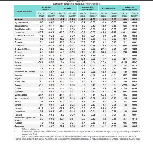 Pero también advirtió una severa reducción general del 7.2 por ciento en la actividad industrial, principalmente generado por la caída del 12.5% en el sector manufacturero. Junto a Hidalgo (-21.3 por ciento) y Campeche (-10%), fueron las entidades con las mayores reducciones en este rubro durante febrero pasado.