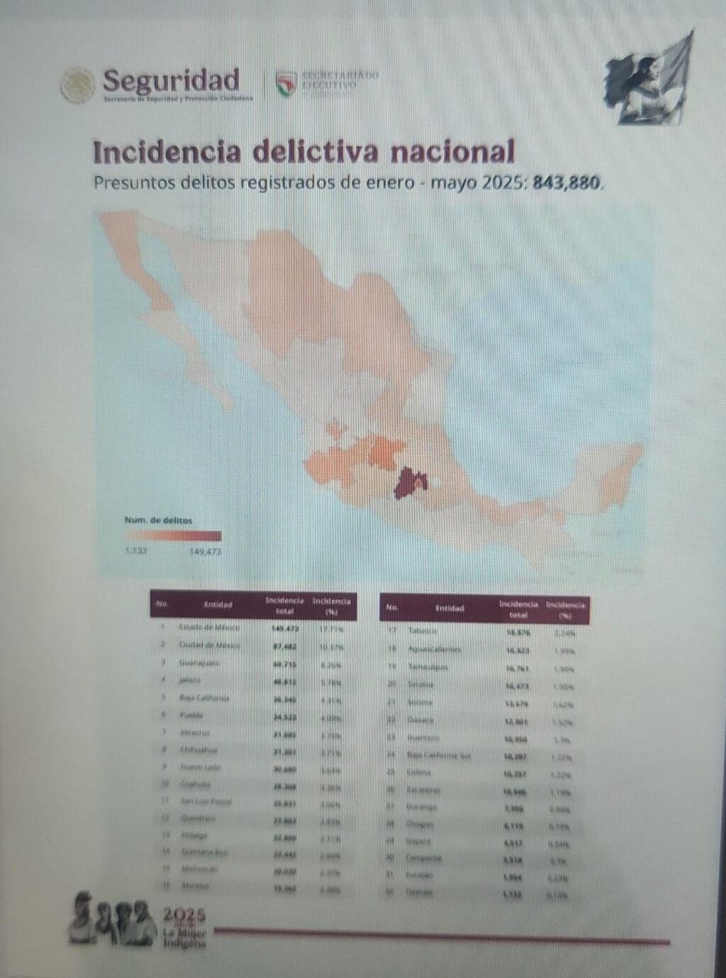 Estado de México encabezó la lista con mayor incidencia delictivica en los primeros cinco meses de 2025, con 149 mil 473 crímenes; seguido de la Ciudad de México con 87 mil 482, Guanajuato en tercer peldaño con 69 mil 715, en el sitio siguiente está Jalisco y el quinto es Baja California .