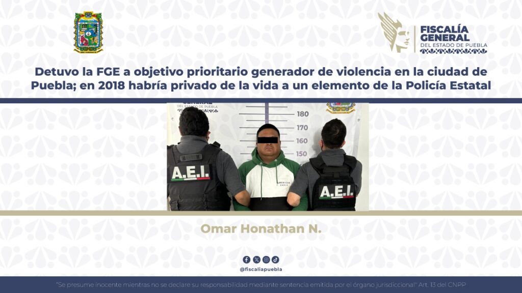 Como resultado de labores de investigación, trabajo de campo e inteligencia, la Fiscalía General del Estado logró la detención de Omar Honathan N., alias “El Negro”, objetivo prioritario para la institución por ser presunto generador de violencia en la ciudad de Puebla a quien se le atribuye su probable participación en el homicidio de un elemento de la Policía Estatal ocurrido en 2018.