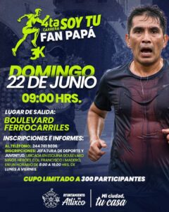 El Ayuntamiento de Atlixco, encabezado por la presidenta municipal Ariadna Ayala, invita a las familias a seguir festejando el Día del Padre con la carrera recreativa “Soy tu fan, papá”, que se realizará el próximo domingo 22 de junio en un circuito de 3 kilómetros con salida y meta en el Boulevard Ferrocarriles.