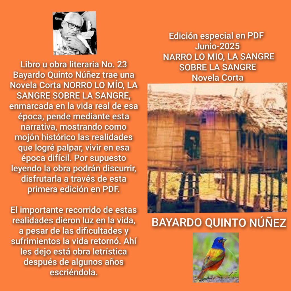 Este es mi libro u obra letrística No. 23. Lo he escrito, porque en la Historia de Nicaragua es una Historia más. Incluso, tengo derecho de escribirla porque soy participe y propietario de los hechos que resultaron en esa época, en mi persona. Y, por la envergadura de los diversos sucesos cuando ingresé al Batallón 8015 de las Milicias Populares de Masaya Nicaragua. Saboreen está realidad verdadera desde mi obra intitulada: ¡NARRO LO MIO, LA SANGRE SOBRE LA SANGRE!, nacida desde la historia misma. Causa de tremenda preocupación, causa de menor o menos sufrimiento. Semejantes cerdos nunca pudieron. Ahora ya es muy tarde, y si llega, todo queda en su santo lugar, todo escrito y expresado. Ante incompetencia de cumplimiento o maledicencia.