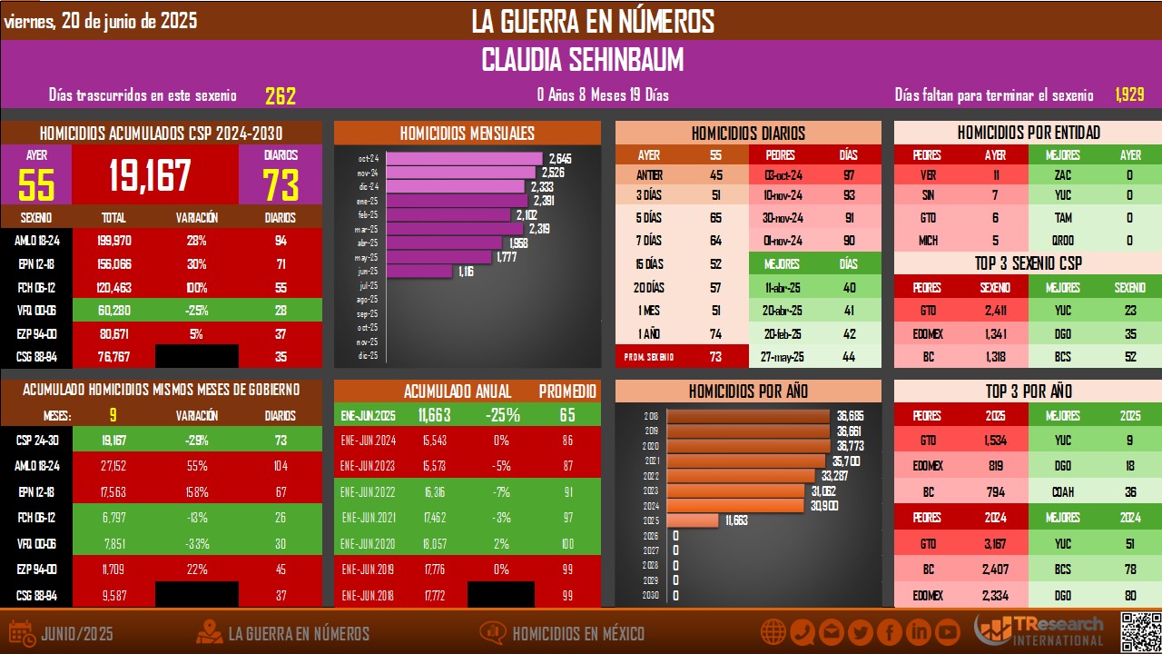 A 262 días del inicio del actual sexenio, México ha registrado 19,167 homicidios, de acuerdo con datos de TResearch, lo que refleja la persistencia de la violencia como uno de los principales retos para la nueva administración.
