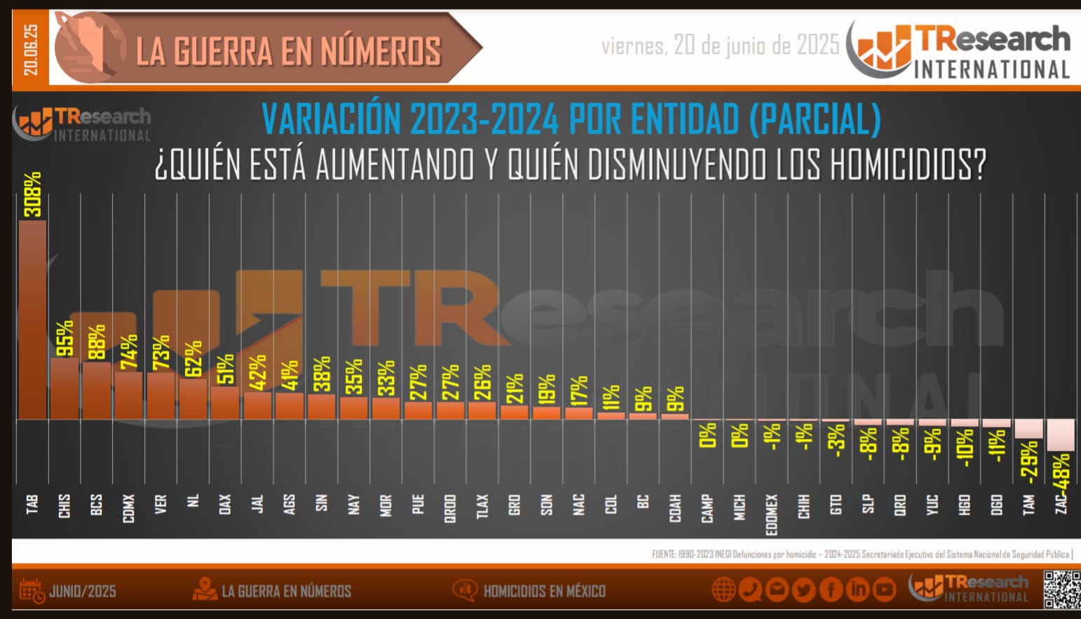 En la comparación parcial entre 2023 y 2024, algunos estados presentan alarmantes aumentos en la violencia homicida. Los cinco con mayores incrementos son: