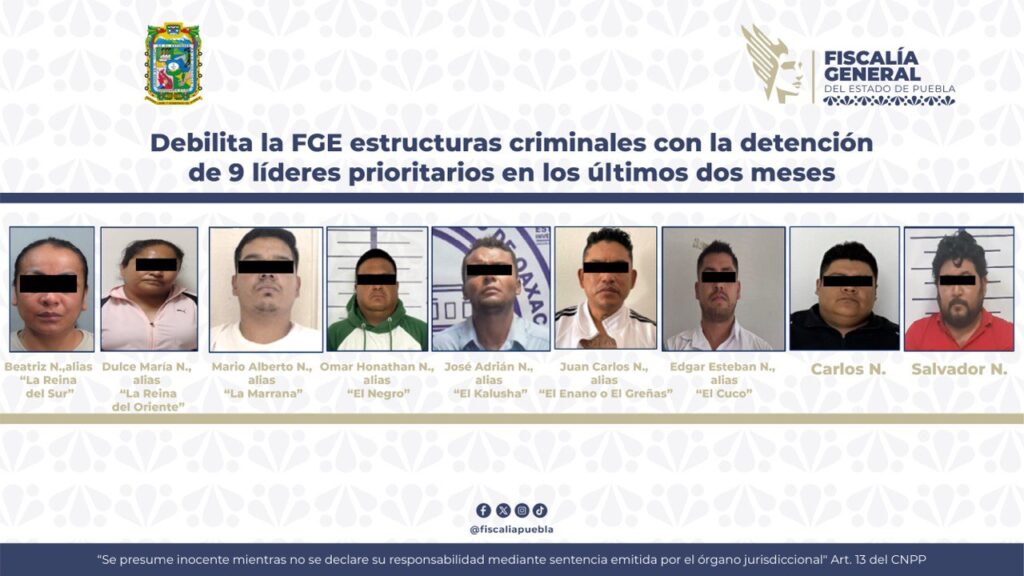 La Fiscalía General del Estado informa que como resultado de las acciones de inteligencia e investigación emprendidas para desarticular organizaciones delictivas en el estado de Puebla, en los últimos dos meses del año han sido detenidos nueve líderes criminales identificados como objetivos prioritarios, logrando debilitar a las principales bandas generadoras de violencia y desestabilización social.