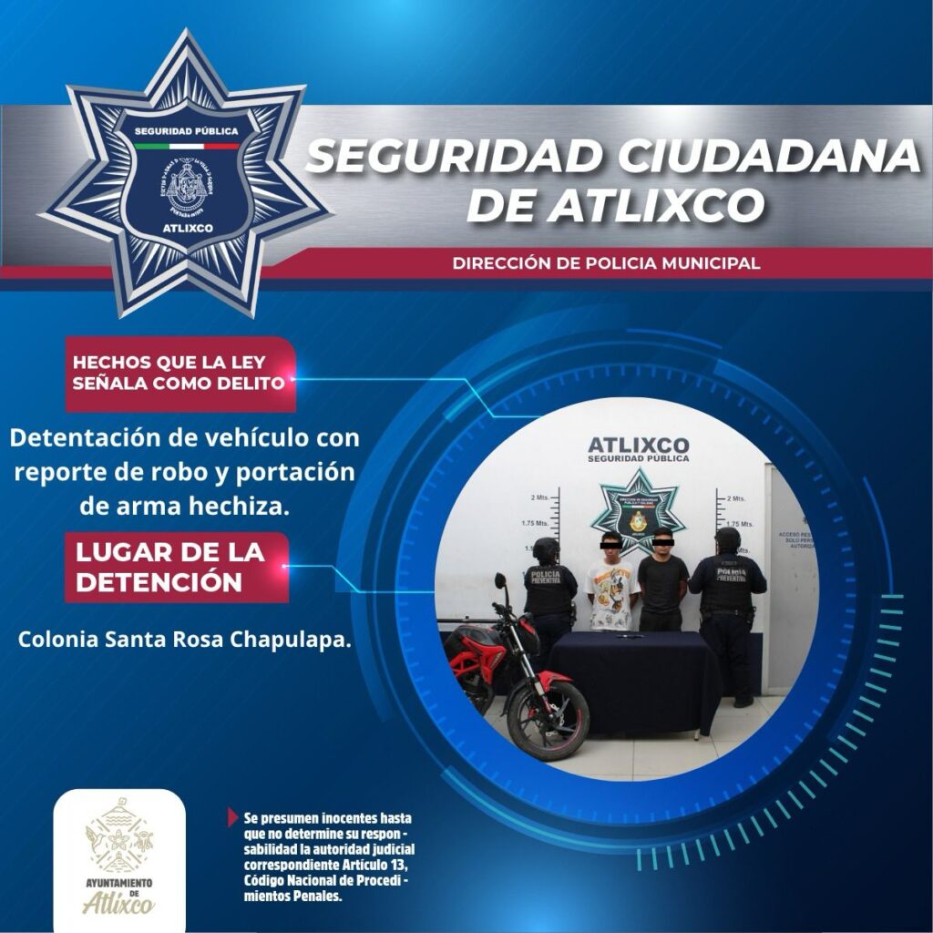 Gracias a una oportuna denuncia ciudadana y a la rápida intervención de elementos de la Policía Municipal de Atlixco, se logró la recuperación de una motocicleta con reporte de robo y la detención de dos individuos por portación de arma, en la colonia Santa Rosa Chapulapa.
