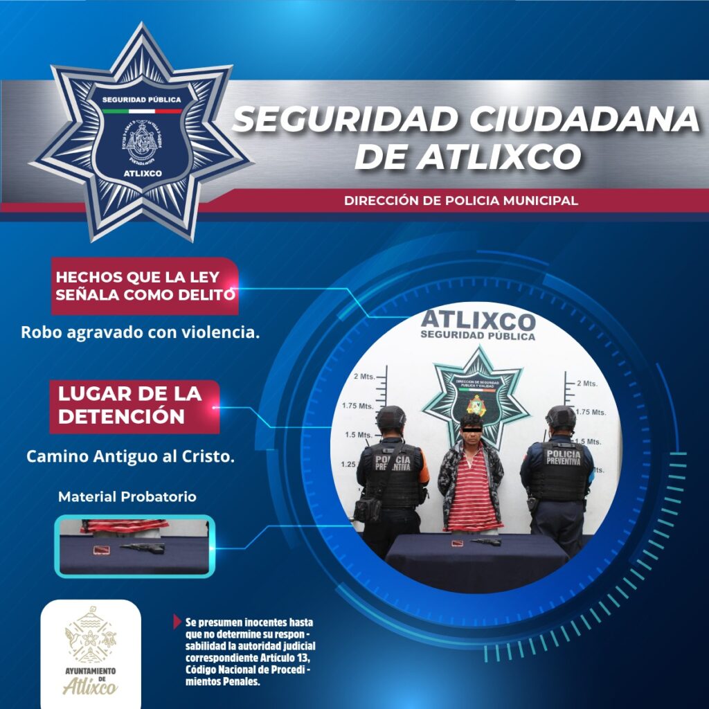 El detenido fue puesto a disposición del Ministerio Público por el delito de robo agravado. Con este tipo de acciones, la Policía de Atlixco reafirma su compromiso con la seguridad y bienestar de las y los ciudadanos.