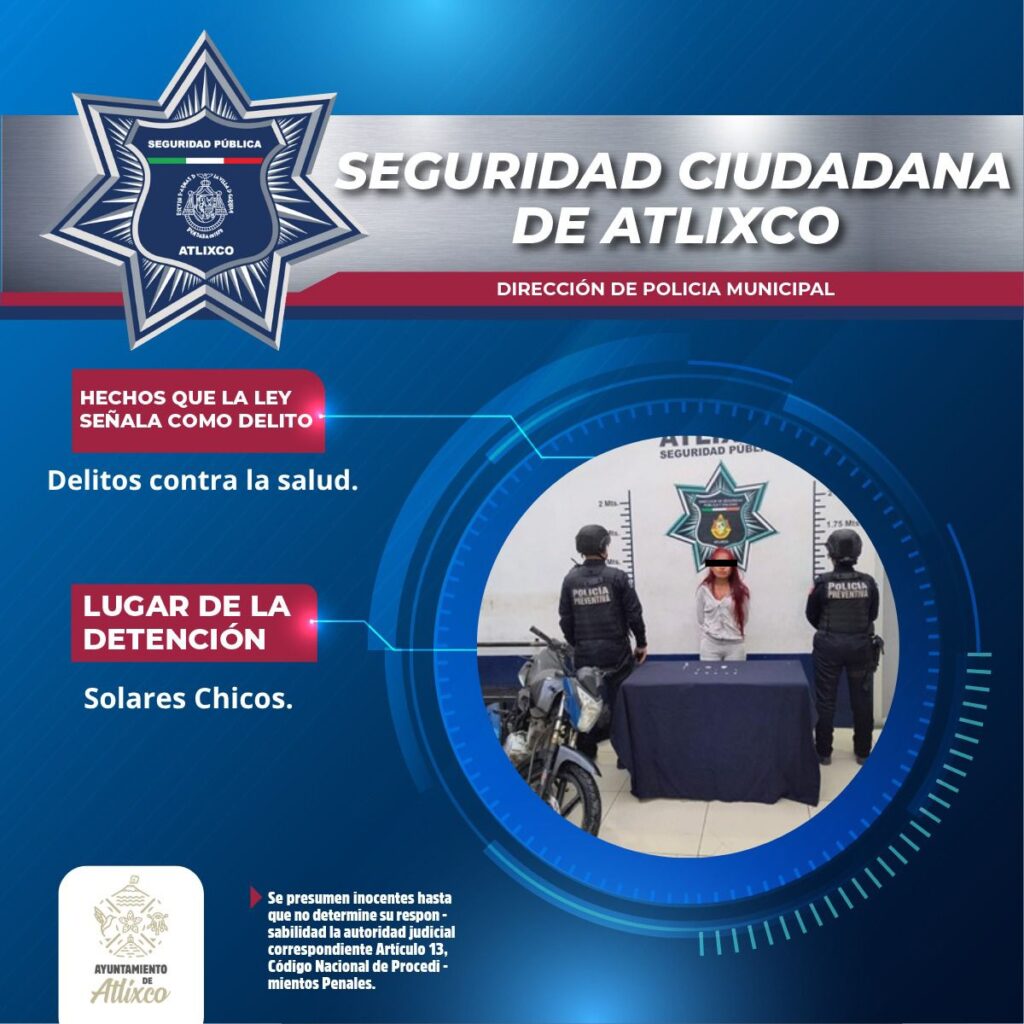Durante un recorrido de vigilancia elementos de la Policía Municipal de Atlixco detuvieron a una mujer en posesión de sustancias ilícitas.