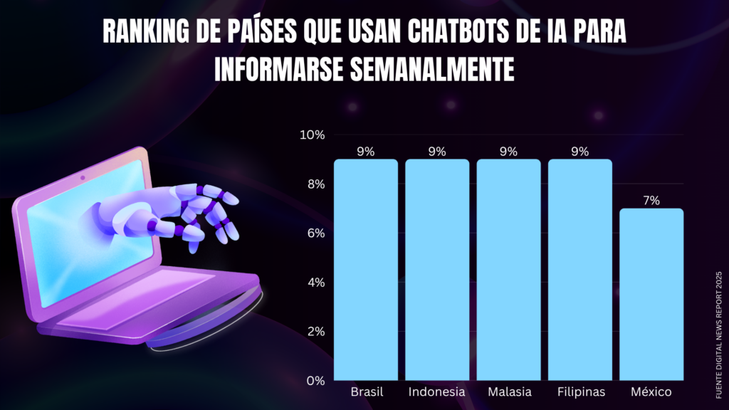 Cabe destacar que el impacto de la IA no se agota en el entorno laboral. El Digital News Report 2025, elaborado por el Instituto Reuters, muestra que un 7% de los mexicanos utiliza semanalmente chatbots de inteligencia artificial como fuente principal de noticias, superando en este aspecto a países como Japón, Alemania o el Reino Unido. Herramientas como ChatGPT o Gemini se integran cada vez más en buscadores y redes sociales, particularmente entre los usuarios más jóvenes.