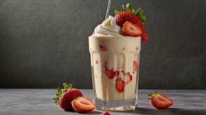 6. Sirve en un vaso y decora con crema batida y fresas picadas.