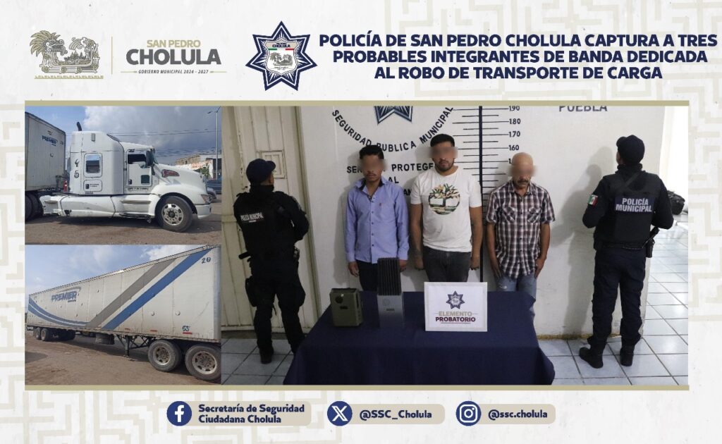 *18 de julio, 2025. San Pedro Cholula, Pue. —* Como resultado de un operativo estratégico y una intervención oportuna, elementos de la Secretaría de Seguridad Ciudadana de San Pedro Cholula (SSC Cholula) lograron la captura de tres hombres como probables responsables de los delitos de robo con violencia, privación ilegal de la libertad y ataques a las vías de comunicación.