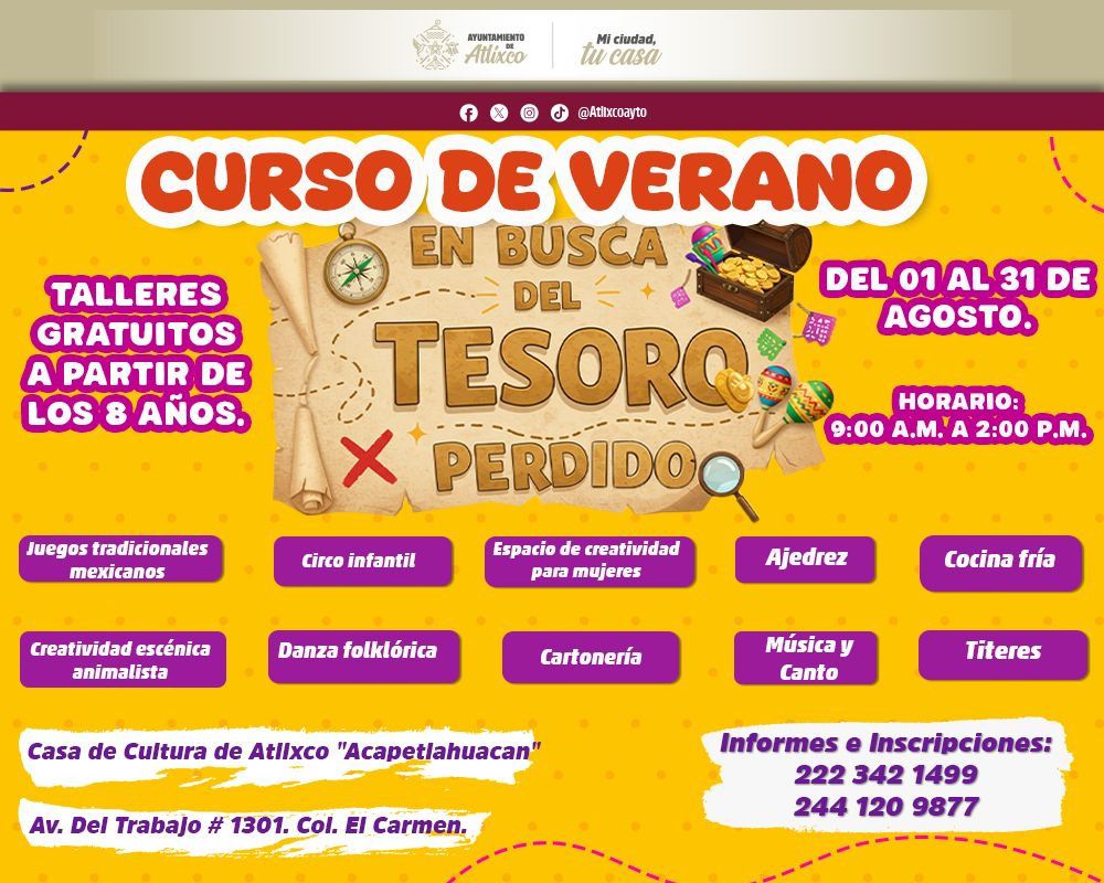 Como parte de su compromiso con la reconstrucción del tejido social a través del arte y la cultura, la presidenta municipal de Atlixco, Ariadna Ayala, invita a madres y padres de familia a inscribir a sus hijas e hijos al Primer Curso de Verano de la Casa de Cultura: “En Busca del Tesoro Perdido”, que se realizará del 1 al 31 de agosto, en un horario de 9:00 a 14:00 hrs.
