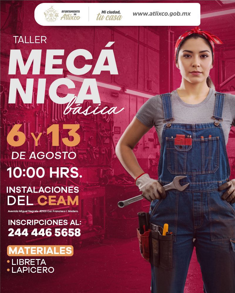El gobierno de Atlixco que encabeza la presidenta municipal, Ariadna Ayala, invita a todas las mujeres a participar en los talleres gratuitos de mecánica automotriz que se llevarán a cabo los días 6 y 13 de agosto en las instalaciones del Centro Especializado para la Atención de la Mujer, (CEAM).