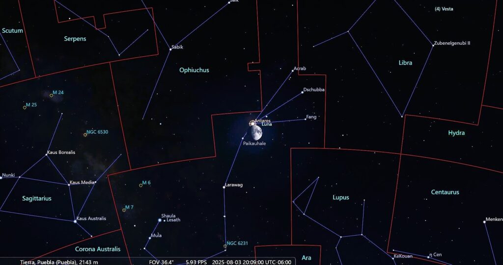 El 4 de agosto a las 2:09 horas de Tiempo Universal (agosto 3 a las 20:09 horas del Centro de México) y para nuestras latitudes, la Luna estará realizando un acercamiento a la estrella Antares (α Sco), pasando a sólo unos minutos de arco, en dirección de la constelación del Escorpión.