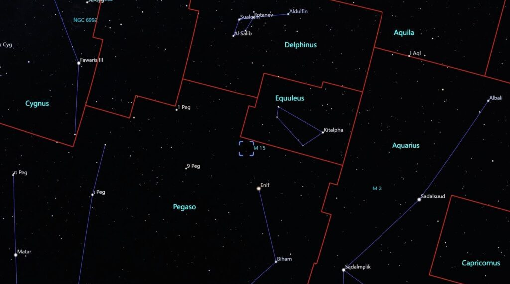M15 es uno de los enjambres estelares más conspicuos, quizá el más denso y el primero en el que se identificó una nebulosa planetaria. Está a una distancia de unos 32,620 años luz; tiene un diámetro de 18 minutos de arco, con una extensión lineal de aproximadamente 175 años luz y con magnitud absoluta de -9.17 o alrededor de 360,000 veces la del sol y una magnitud aparente de 6.3, que se encuentra en el límite de visibilidad para el ojo humano, bajo condiciones muy favorables. Unos prismáticos o un telescopio pequeño lo deja ver como un objeto nebuloso redondo, hacia la constelación del Pegaso, en la parte este de la esfera celeste.