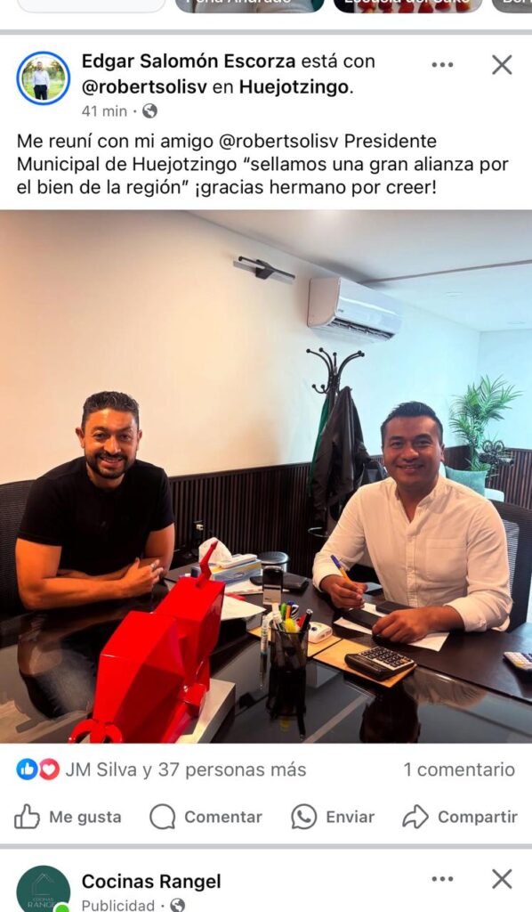 La semana pasada, el presidente municipal presuntamente de la 4T de Huejotzingo, Roberto Solís Valles y el ex director de la Universidad Tecnológica de dicha ciudad (UTH), Édgar Salomon Escorza, presumieron su mutua cercanía en redes sociales, como lo demuestra la foto posteada.