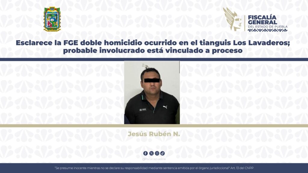 La Fiscalía General del Estado de Puebla informa que como resultado de las investigaciones realizadas se esclareció el doble homicidio ocurrido en el tianguis conocido como Los Lavaderos. Jesús Rubén N., fue vinculado a proceso como probable responsable de los delitos de homicidio calificado y homicidio calificado en grado de tentativa.