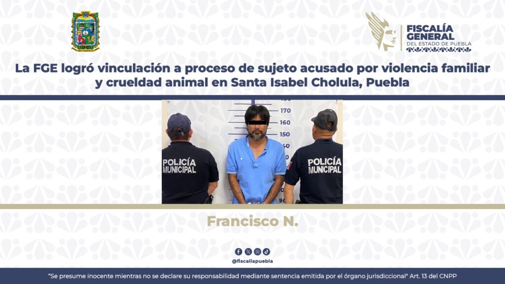 La Fiscalía General del Estado logró mediante la aportación de diversos datos de prueba, la vinculación a proceso de Francisco N., de 41 años de edad, acusado de violencia familiar y de delitos contra los animales mediante actos de crueldad en el municipio Santa Isabel Cholula, Puebla.