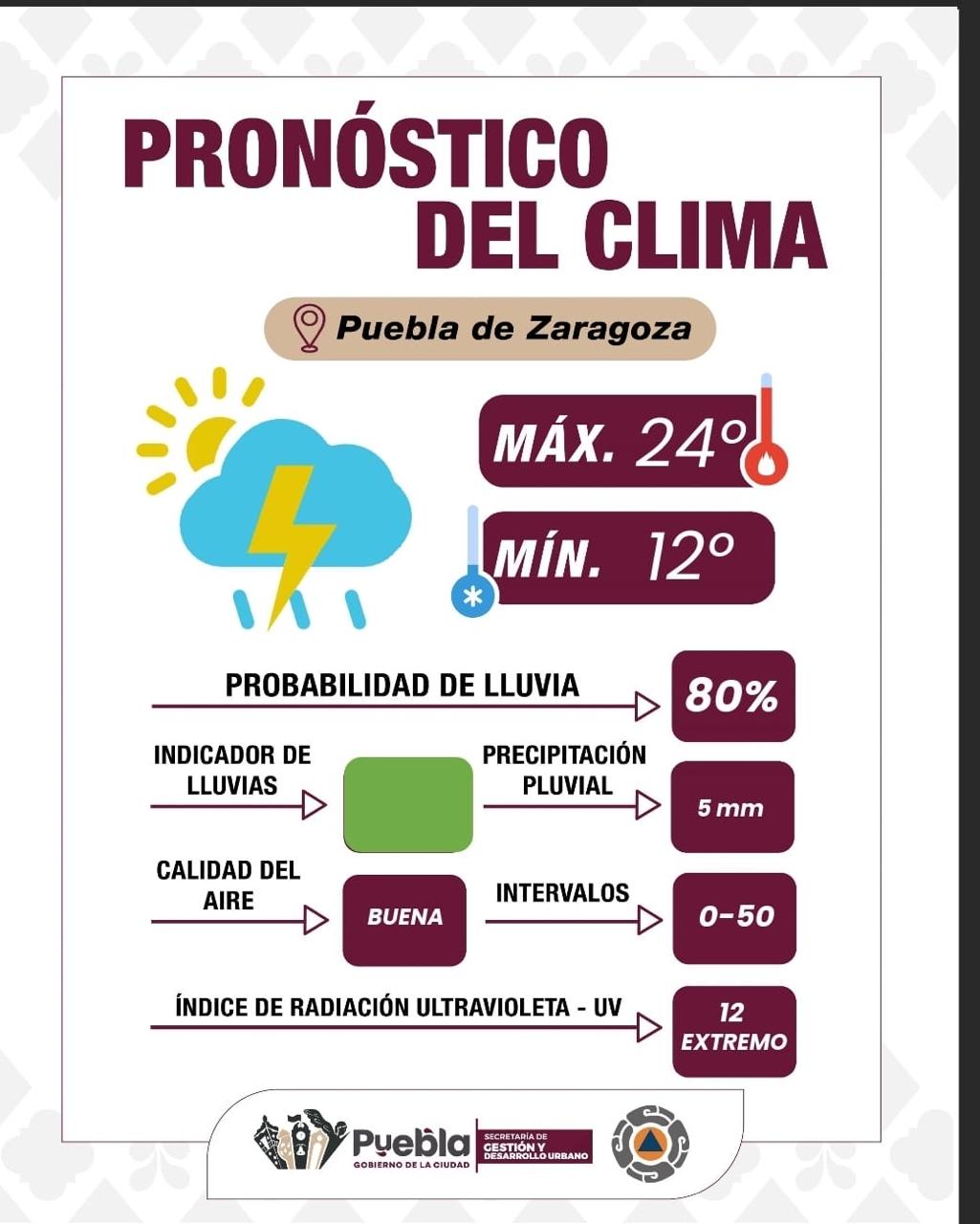 El Gobierno de la Ciudad, a través del Departamento de Alertamiento de la Dirección de Gestión de Riesgos en Materia de Protección Civil de la Secretaría de Gestión y Desarrollo Urbano, informa que para este miércoles se espera un día parcialmente nublado, con condiciones favorables para el desarrollo de lluvias acompañadas de tormenta eléctrica durante la tarde. Se prevé una acumulación de precipitación de entre 0 y 5 mm alrededor de las 19:00 horas.