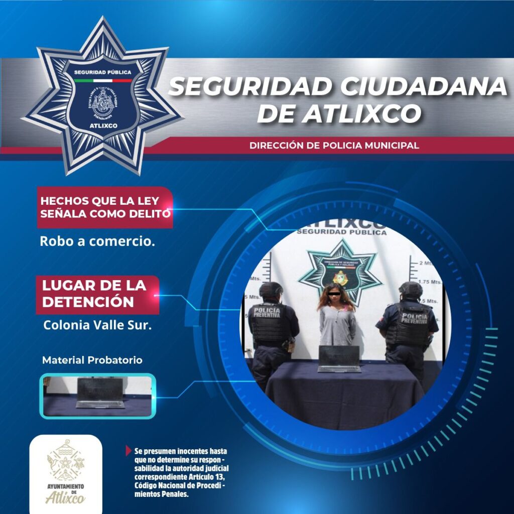 Gracias a la pronta intervención de la Policía Municipal de Atlixco, se logró la detención de una mujer señalada como probable responsable del robo de una computadora portátil en un comercio de la colonia Valle Sur. Tras recibir el reporte de auxilio, los elementos iniciaron de inmediato un operativo que permitió ubicarla y asegurarla en la calle Álvaro Obregón.
