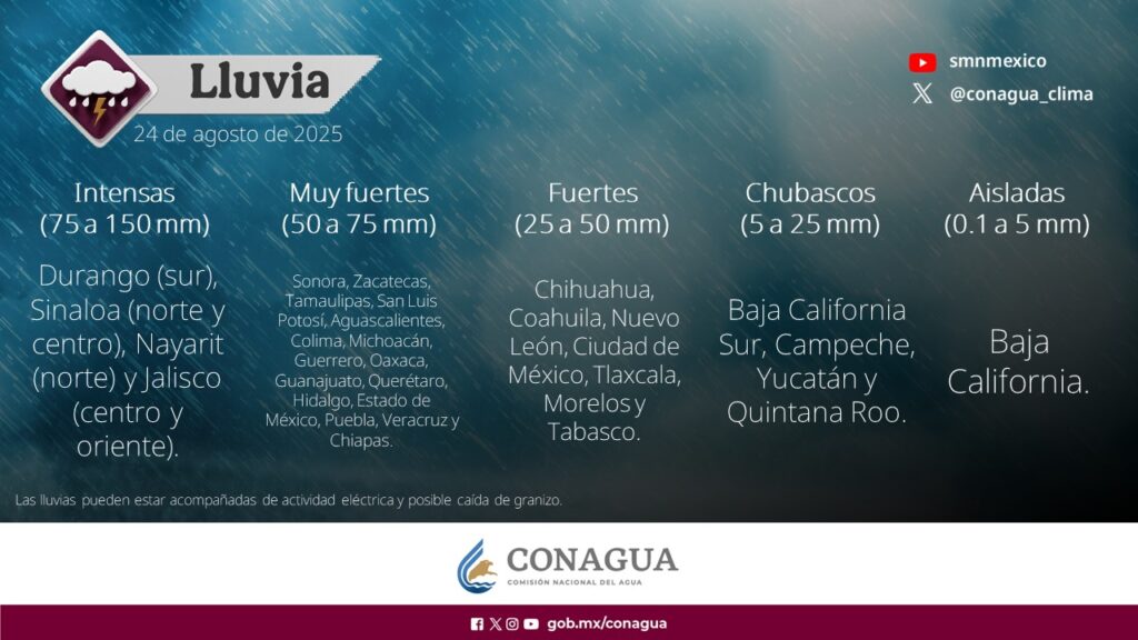 La Comisión Nacional del Agua (Conagua) informó que este sábado 24 de agosto de 2025 se prevén lluvias de distintas intensidades en gran parte del país, acompañadas de actividad eléctrica y posible caída de granizo.