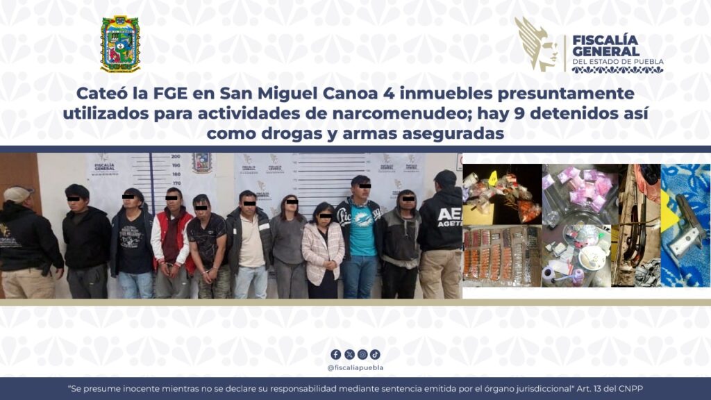 La Fiscalía General del Estado de Puebla realizó acciones para combatir el narcomenudeo en la junta auxiliar de San Miguel Canoa, del municipio de Puebla, logrando la detención de nueve personas, dos femeninas y siete masculinos, presuntamente en posesión de droga y armas de fuego.