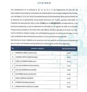 La lista de las nueve propuestas a candidatos para contender por la rectoría de la Universidad Autónoma de Puebla para el periodo de 2025-2029 es encabezada por Lilia Cedillo Ramírez, quien buscaría su segundo período como rectora.