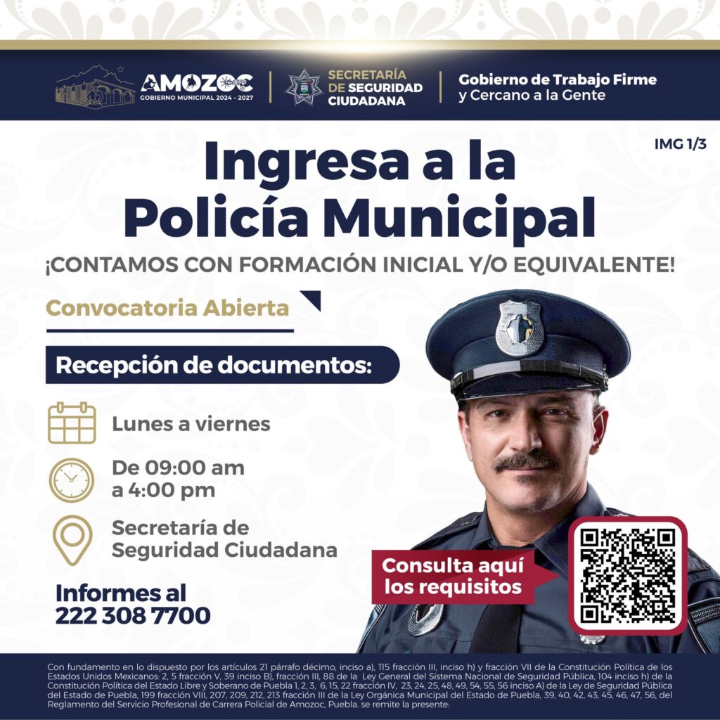 La Secretaría de Seguridad Ciudadana de Amozoc informa que se encuentra abierta la convocatoria para el ingreso a la Policía Municipal, dirigida a todas aquellas personas que cuenten con formación inicial y/o equivalente.