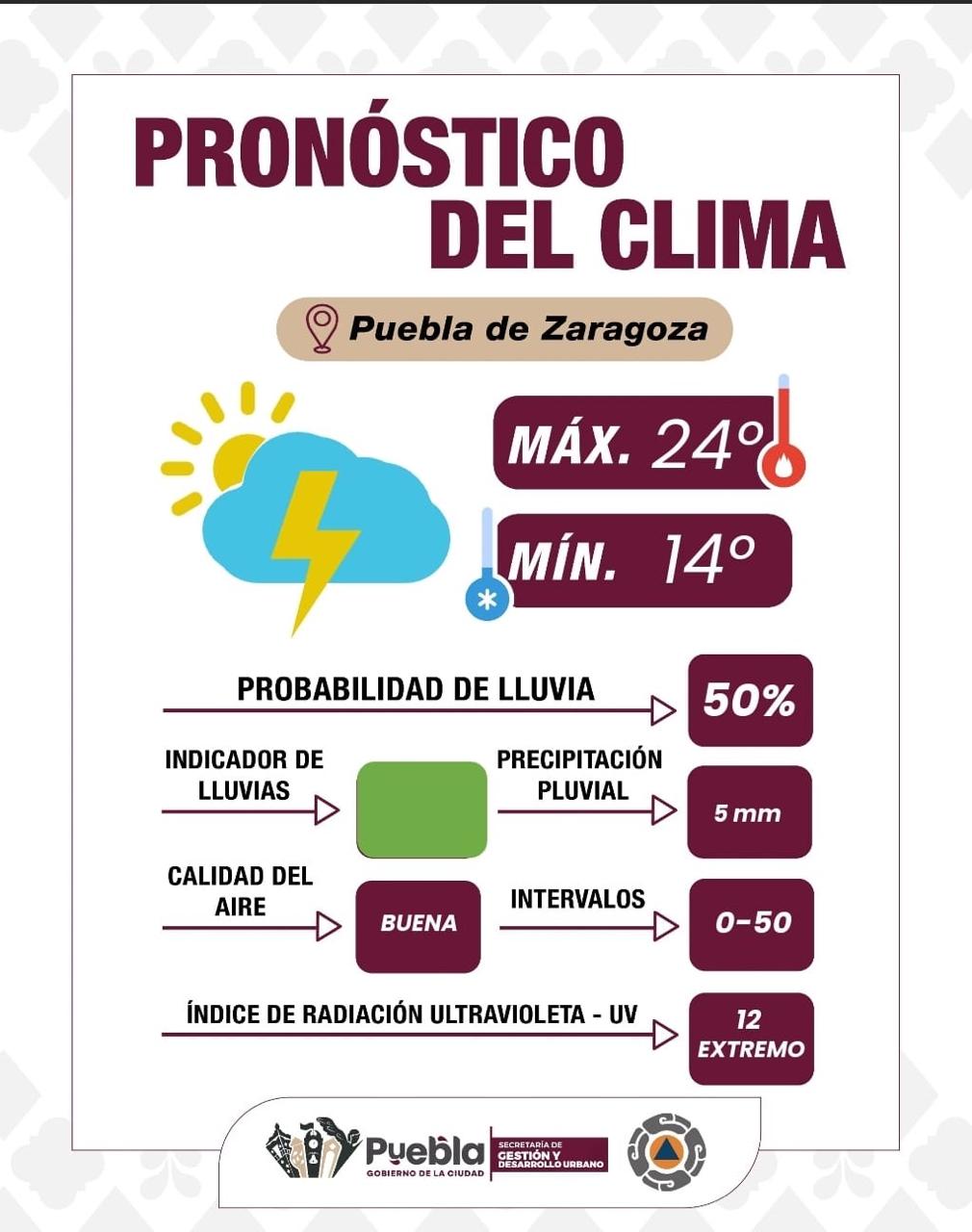 Se esperan condiciones parcialmente nubladas, con una probabilidad media de lluvias acompañadas de tormentas eléctricas durante la tarde, aproximadamente a las 17:00 horas. La acumulación de agua se estima entre 0 a 5 mm.