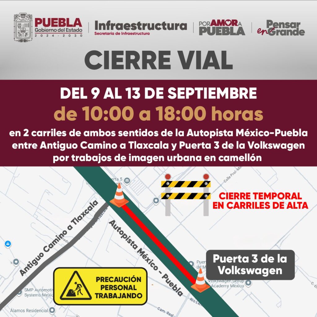 📰 #InfraInforma | CIERRE VIAL EN 2 CARRILES DE AMBOS SENTIDOS DE LA AUTOPISTA MÉXICO – PUEBLA ENTRE CAMINO ANTIGUO A TLAXCALA Y PUERTA 3 DE LA VOLKSWAGEN.