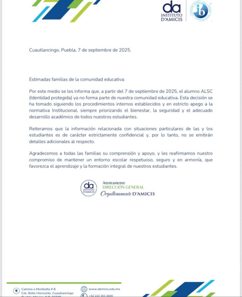 El colegio D´Amicis -a través de un comunicado -informó que a partir de este domingo 7 de septiembre Axel Leonardo N, señalado por su presunta participación en el homicidio de una vecina en Lomas de Angelópolis, dejó de formar parte del instituto.