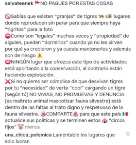 La activista concluyó su mensaje con un llamado a la acción: “Si queremos a los animales, dejen de sacarlos de su hábitat y mejor inviertan en su conservación natural y protección en santuarios que jamás los expondrían a las personas, no en tenerlos en paredes de concreto para presumirlos en zoológicos”.