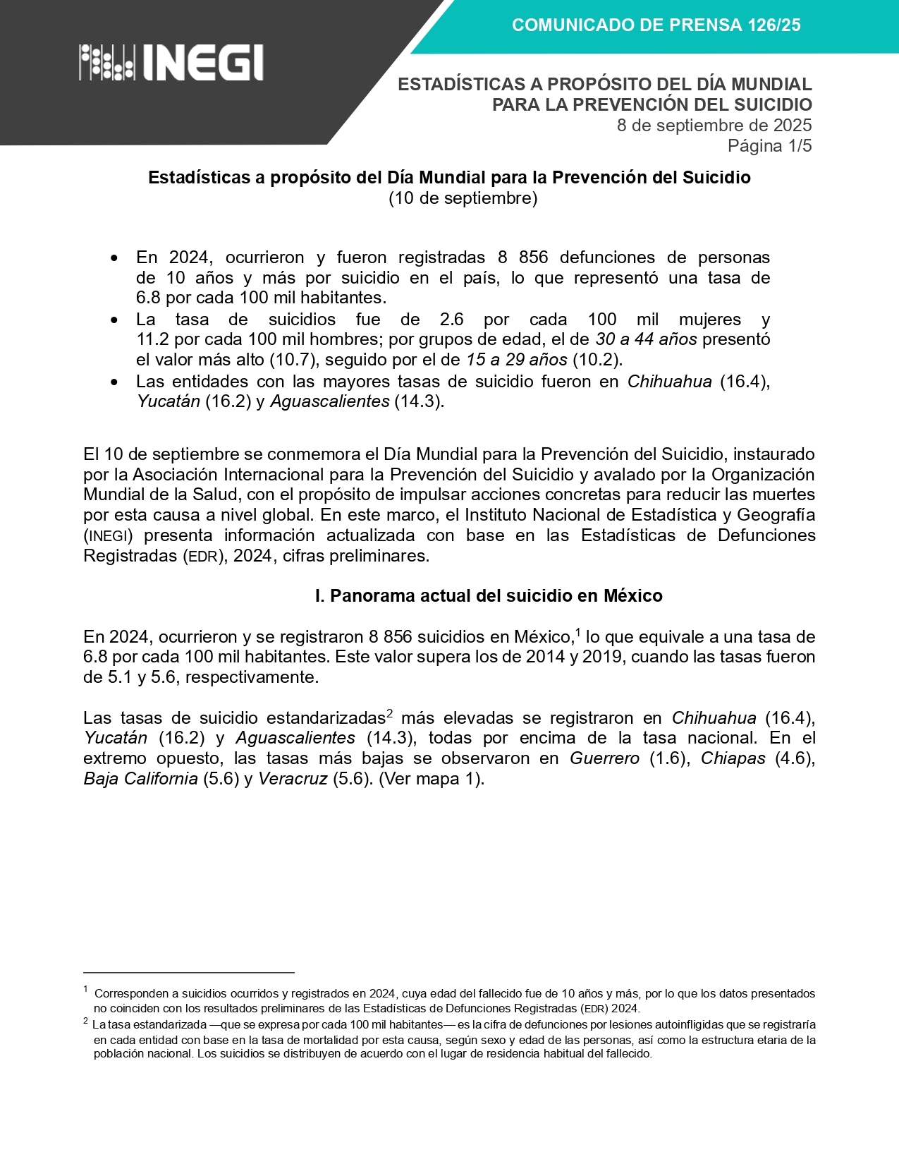Otras entidades con elevados rangos de suicidios consumados son Aguascalientes (14.3), SLP (10.7), Tabasco (9.9), Querétaro (9.7), Jalisco (8.9), Nayarit (8.2), Michoacán (7.8), EdoMéx (8.1), Guanajuato (8.7), Nuevo León (7.3). Curiosamente, uno de los estados con más elevados niveles de violencia en México, Sinaloa, mostró una tasa de autolisis menor al promedio nacional (6.3), lo mismo que Chiapas, la zona más pobre del país (6.2).