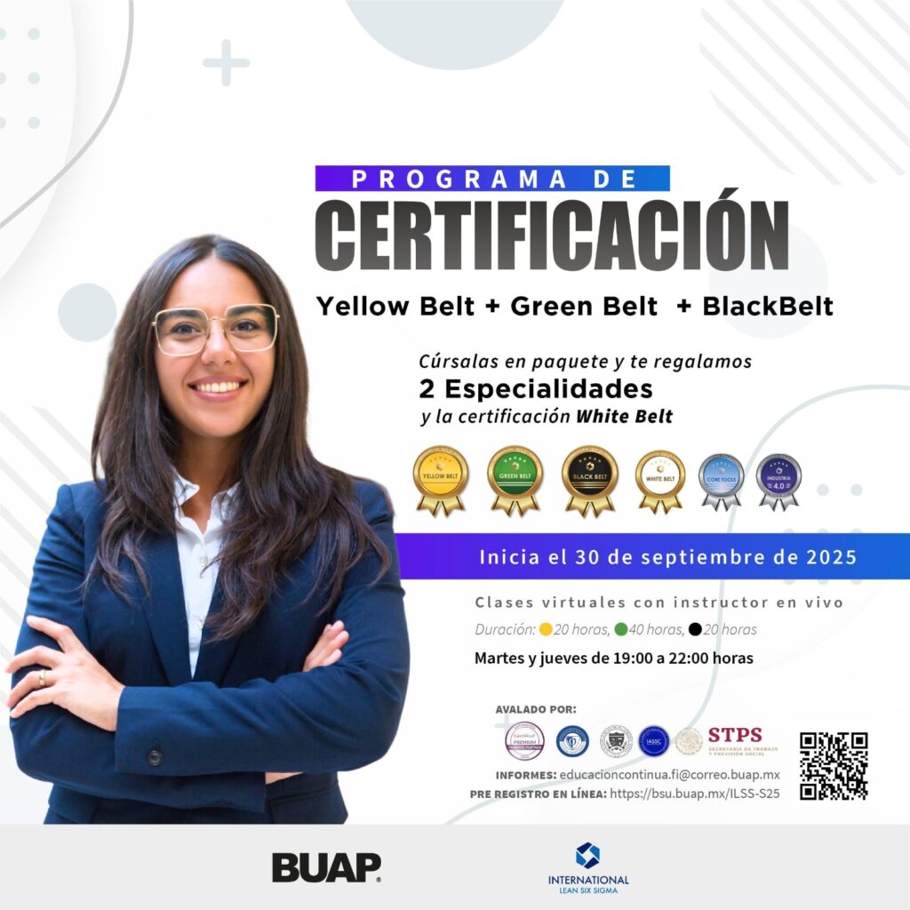 La facultad de Ingeniería de la BUAP, en conjunto con International Lean Six Sigma, convocan al programa de certificación Yellow Belt + Green Belt + Black Belt.