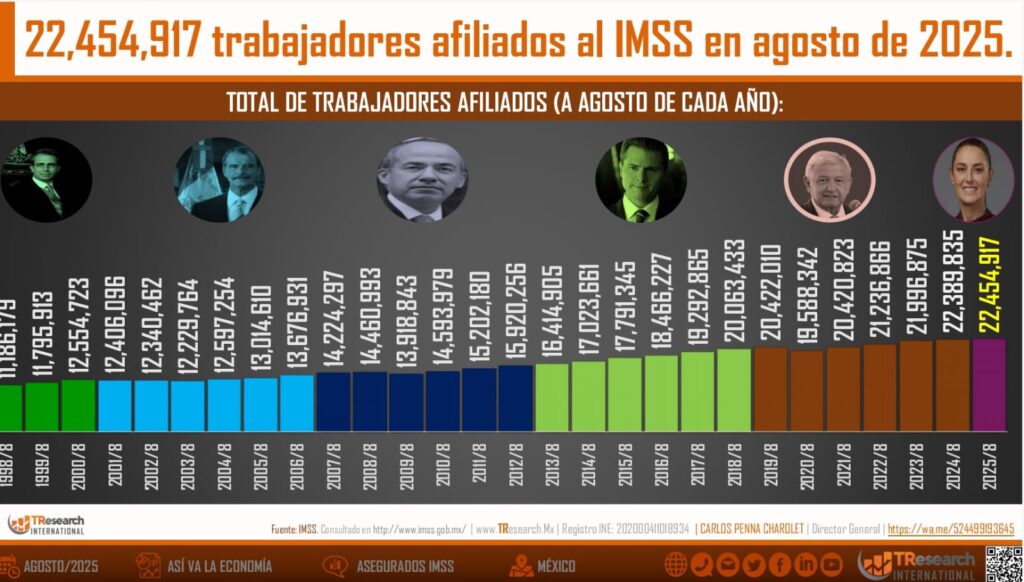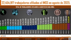 En perspectiva de largo plazo, la afiliación al IMSS se duplicó en casi tres décadas, al pasar de 11,186,179 millones de trabajadores en 1998 a 22,454,917 millones en 2025.