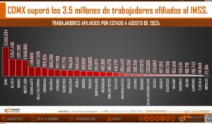 La Ciudad de México encabeza la afiliación con 3.55 millones de trabajadores asegurados, seguida por Jalisco (2.04 millones), Estado de México (1.97 millones), Nuevo León (1.94 millones) y Guanajuato (1.11 millones).
